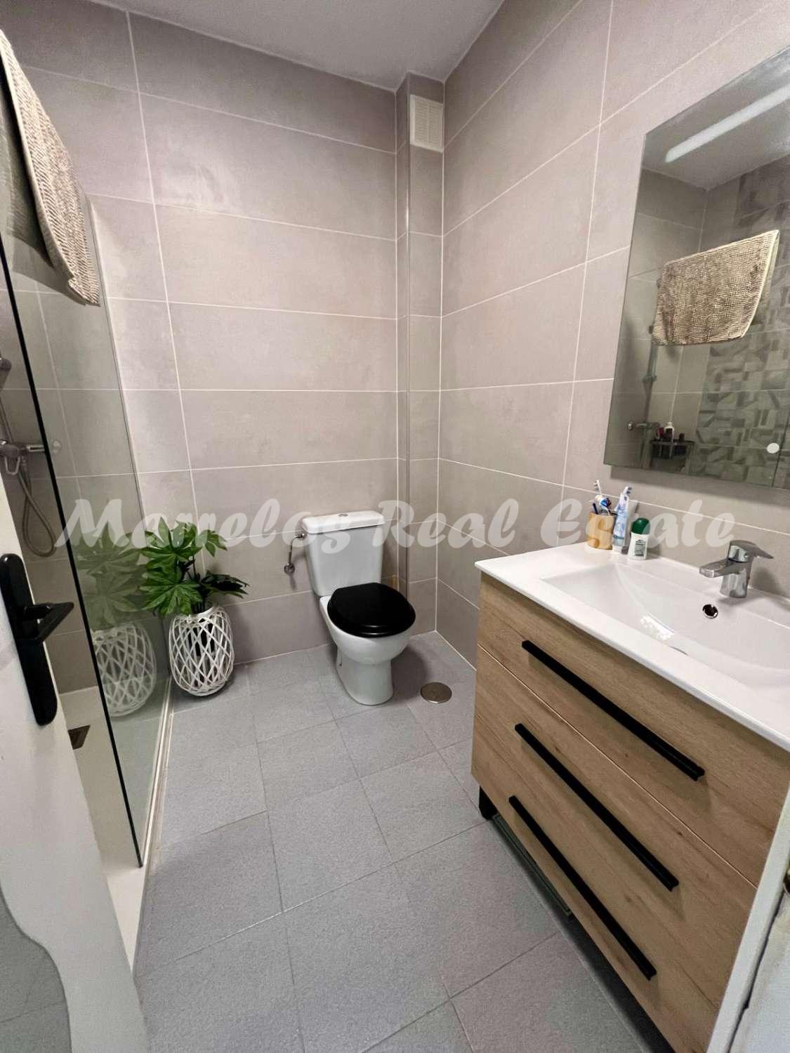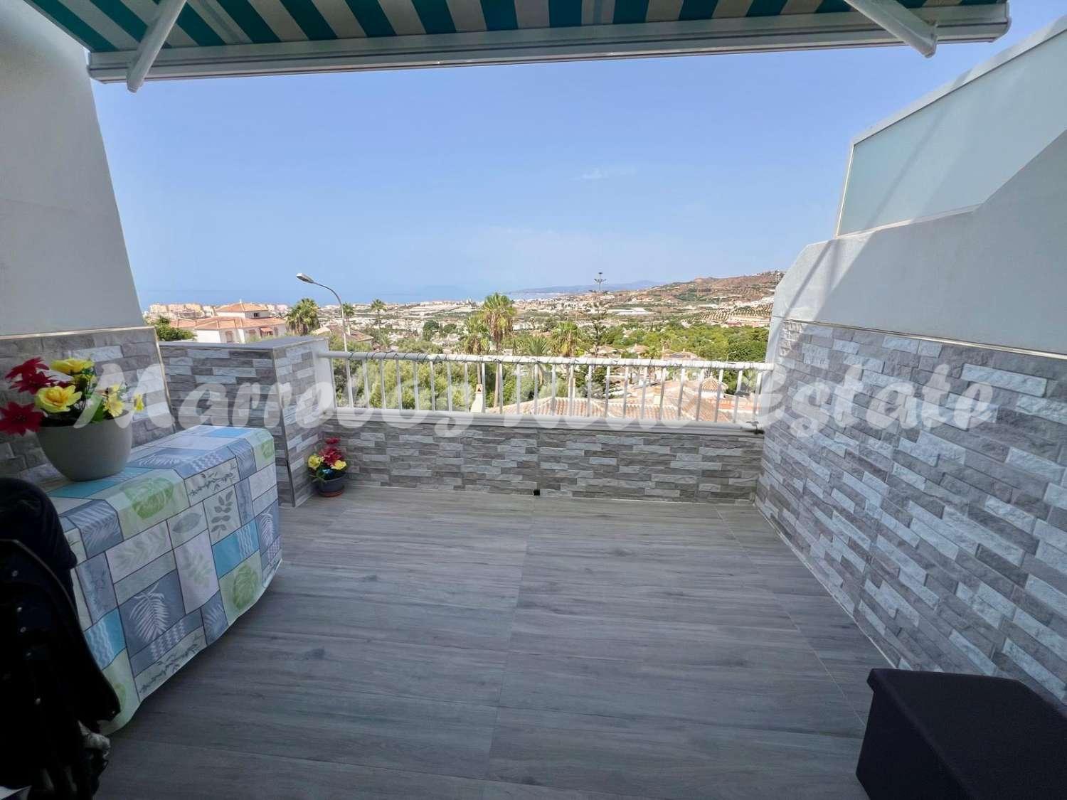 Apartamento con vistas al mar y a la montaña situado en una urbanización tranquila en Torrox Costa. Tiene dos dormitorios y un baño reformado, y salón de buen tamaño con cocina abierta. Desde el salón y el dormitorio principal se puede acceder a la terraza con espacio para una mesa y sillas creando un espacio muy agradable para disfrutar de las vistas y vida en el exterior. Los dormitorios tienen armarios empotrados y ventiladores de techo, y el salón tiene aire acondicionado. Se vende amueblado.